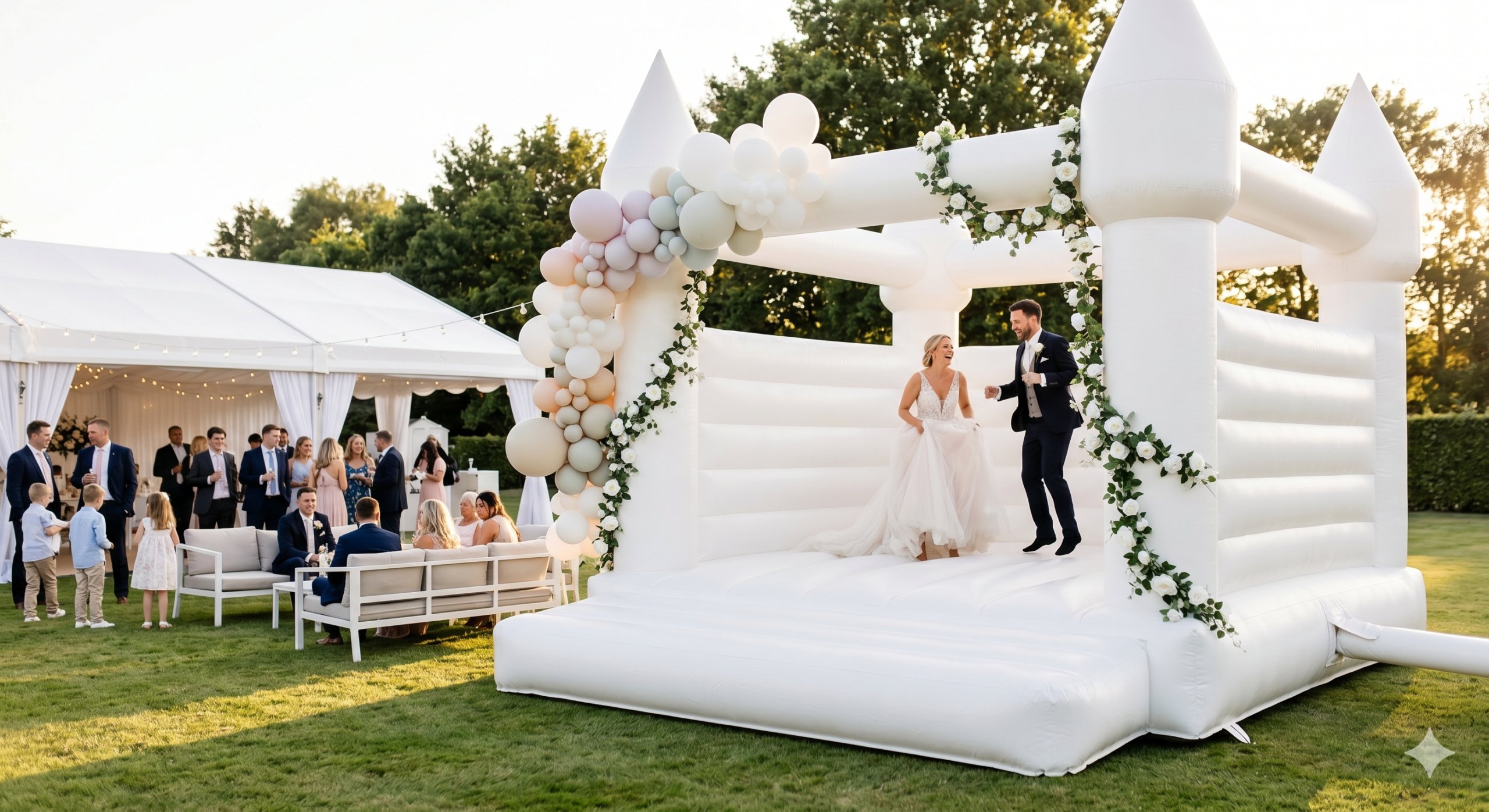 Os noivos modernos buscam experiências “instagramáveis”. Um inflável branco serve como um cenário perfeito para fotos, aceita decorações com balões desconstruídos e flores, e não agride a paleta de cores da festa. Para o empresário, isso significa a possibilidade de alugar um único brinquedo por um valor 3x ou 4x superior ao de um pula-pula convencional, já que ele entra na planilha de cenografia e decoração, e não apenas recreação.